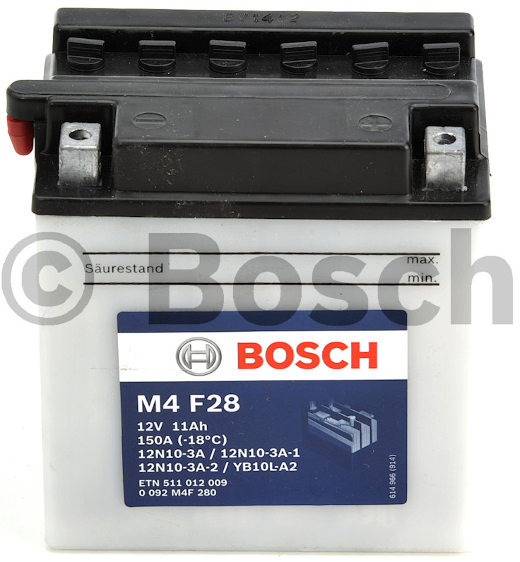 Аккумулятор Bosch 0092M4F280 ёмкость 10 пусковой ток 150A полярность обратная (-/+)